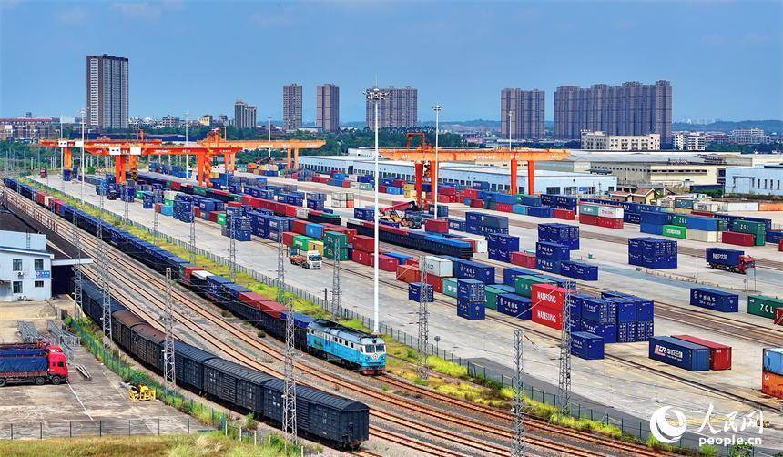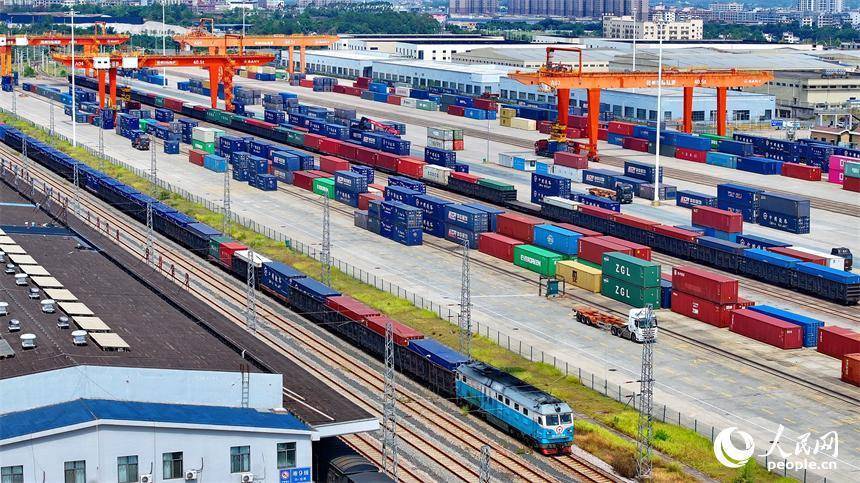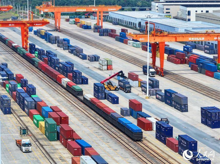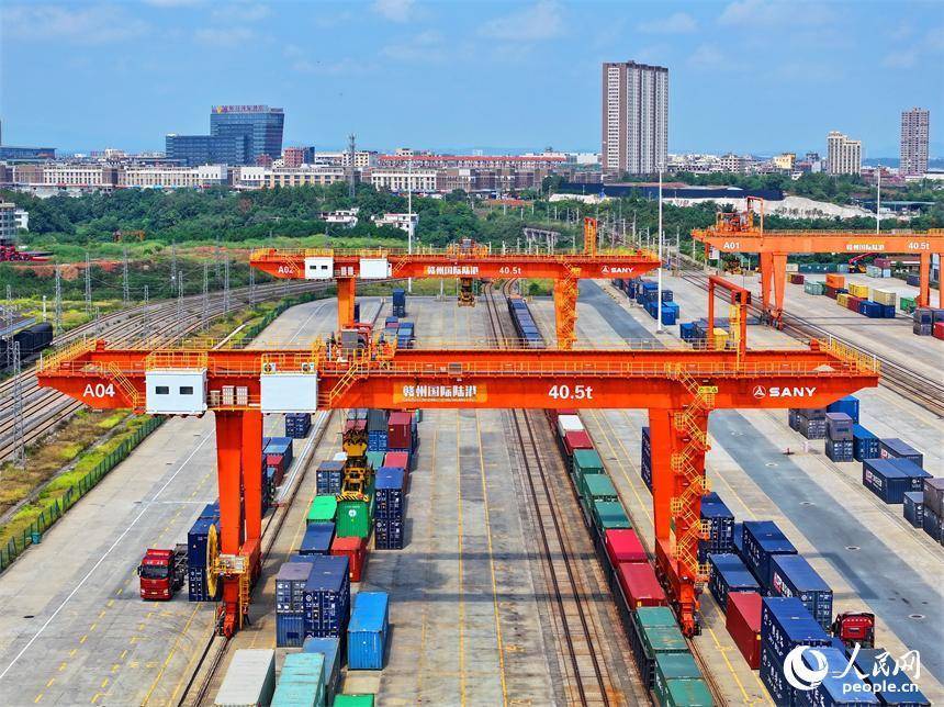 赣州国际陆港货场内集装箱装卸繁忙,各类班列有序进出港。人民网 朱海鹏摄人民网赣州10月11日电 (朱海鹏)近日,江西省赣州市南康区,赣州国际陆港货场内集装箱装卸繁忙,各类班列有序进出港。