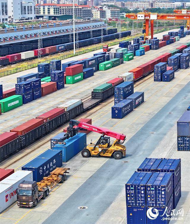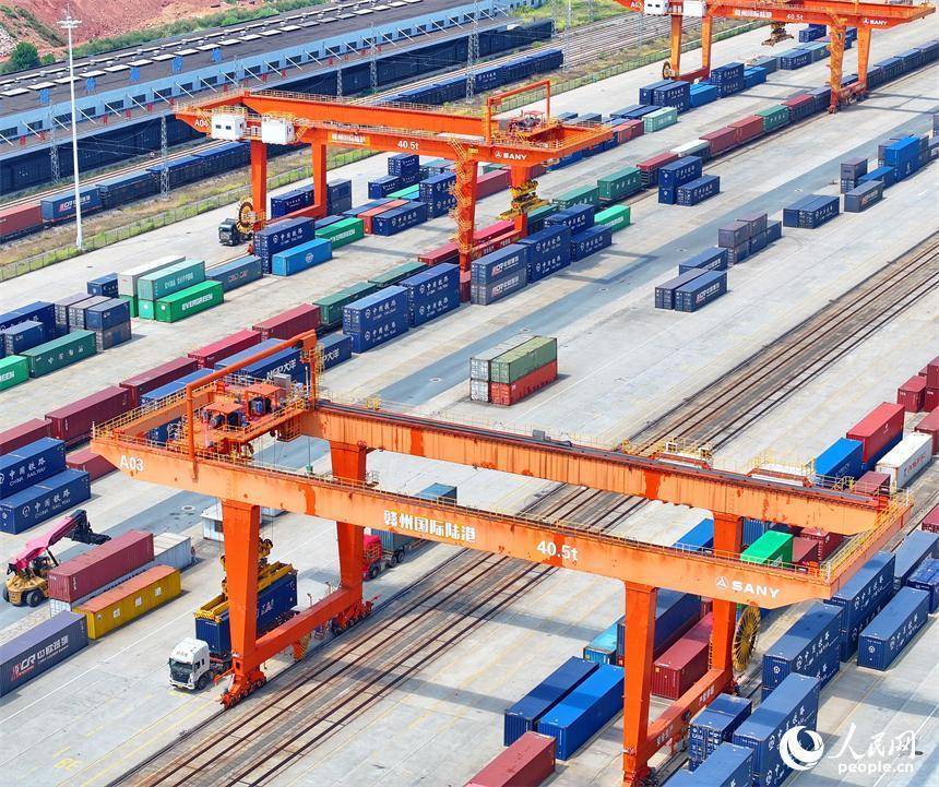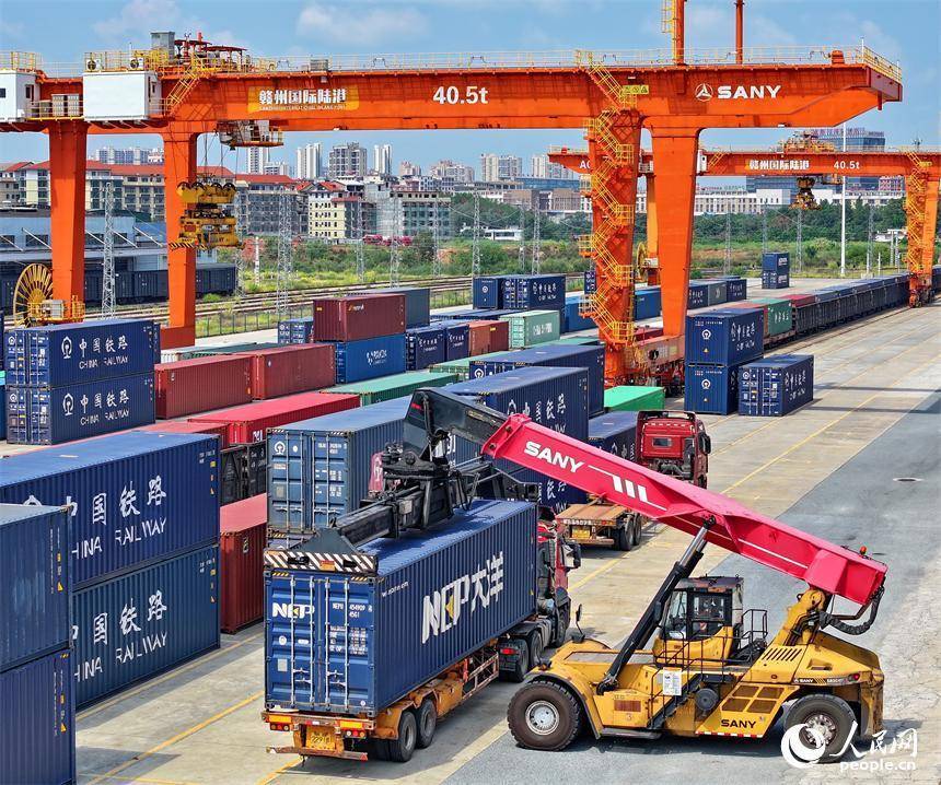 赣州国际陆港货场内集装箱装卸繁忙,各类班列有序进出港。人民网 朱海鹏摄